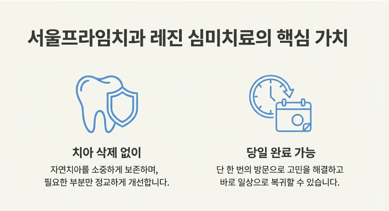 서울프라임치과에서는 직접수복 → 라미네이트 → 크라운 → 교정 순으로 가능한 선택지를 설명드린 후, 환자분께 가장 부담이 적고 예후가 좋은 방법을 제안드립니다.